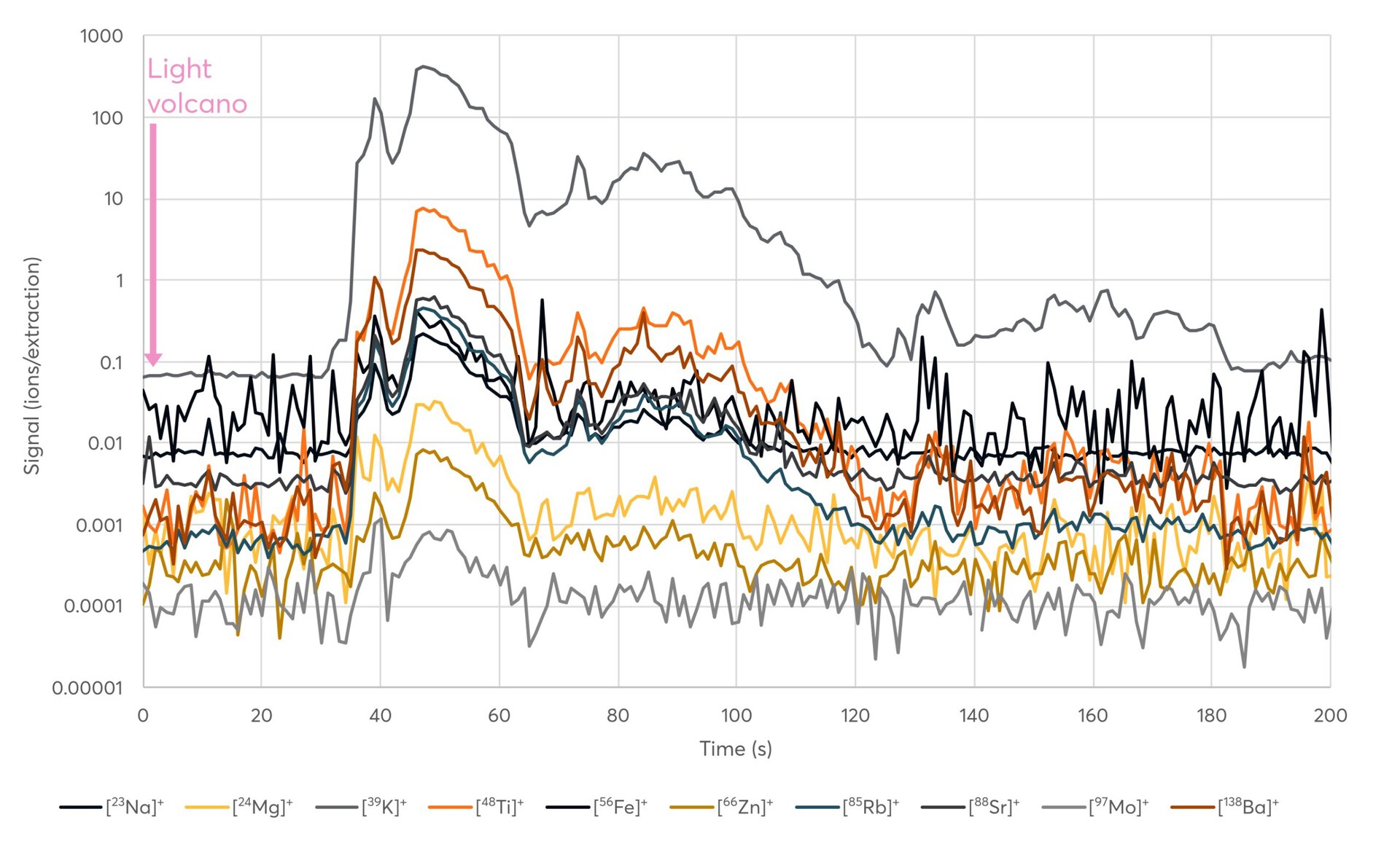 Data recorded from a “silver vulcano” firework at 10 m distance. The lighting of the vulcano is indicated. Measured elements include Na, Mg, K, Ti, Fe, Cu, Zn, Rb, Sr, Mo, Ba.