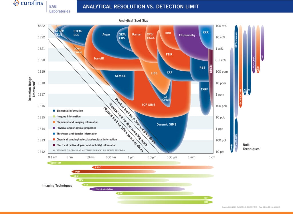 [8] Chart comparing detection limits and spatial resolution for different techniques taken from EAG Laboratories, 06.11.2023. https://www.eag.com/techniques/