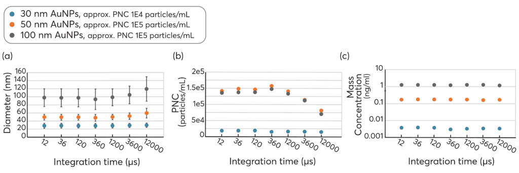 Quantified results are presented in Figure 2. No notable difference in quantification is observed with integration times of 12 µs up to 1.2 ms. This suggest that while ultra-fast acquisition times (e.g., 12 µs) is possible, it may not be necessary for accurate quantification. On the other hand, longer integration times of > 1.2 ms pose a risk of capturing multiple nanoparticles within a single pulse, necessitating adjustments to the PNC and, indirectly, the dilution factor relative to the data acquisition frequency. At higher nanoparticle concentrations, the likelihood of co-occurring signals increases, complicating the distinction between individual nanoparticles. In this study, 50 nm and 100 nm Au nanoparticles were present at higher concentrations compared to the 30 nm Au nanoparticles.