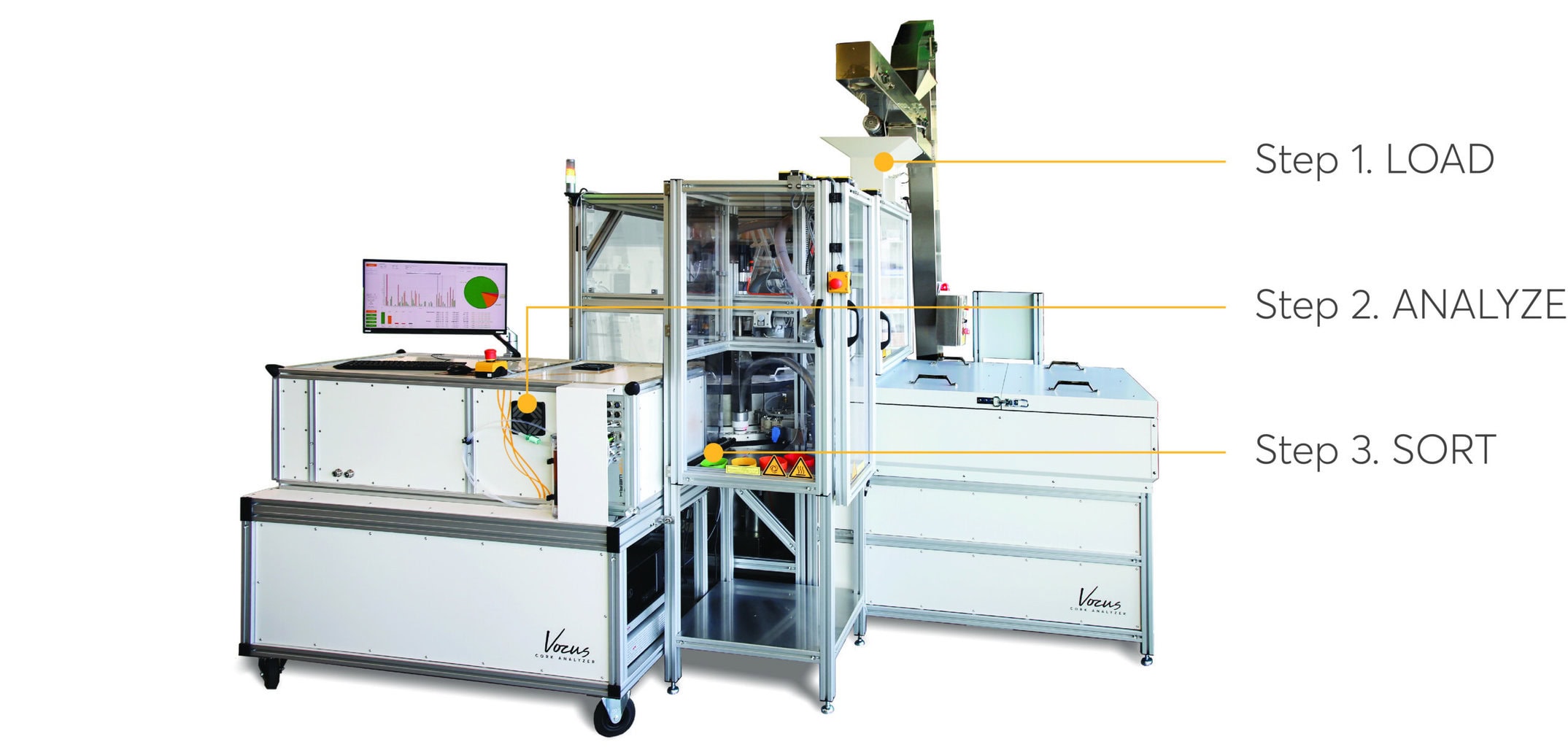 Operation of the Vocus Cork Analyzer is fully automated for high-throughput analysis of cork wine stoppers in your production facility. Corks are processed in 3 simple steps.